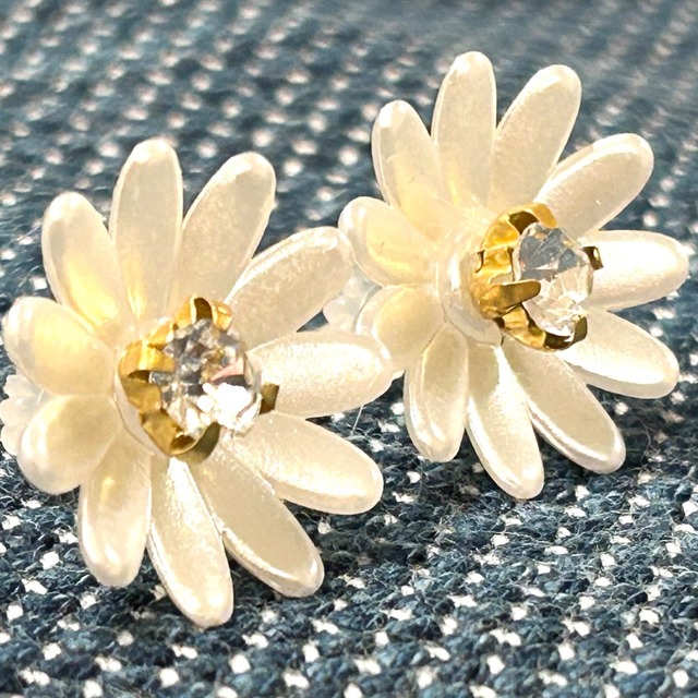 ♡商品説明 ホワイトカラーのやさしい雰囲気漂うフラワーデザインピアス。 軽やかなプラスチック素材で耳元に負担が少なくカジュアルに使いやすいアイテムです。 中央は光を受けて輝き、リーズナブルなのに華やかさもプラス。 カジュアルにもフェミニンにも合わせやすい毎日つけたくなる一品です。 ♡素材 プラスチック、樹脂(ポスト部分)