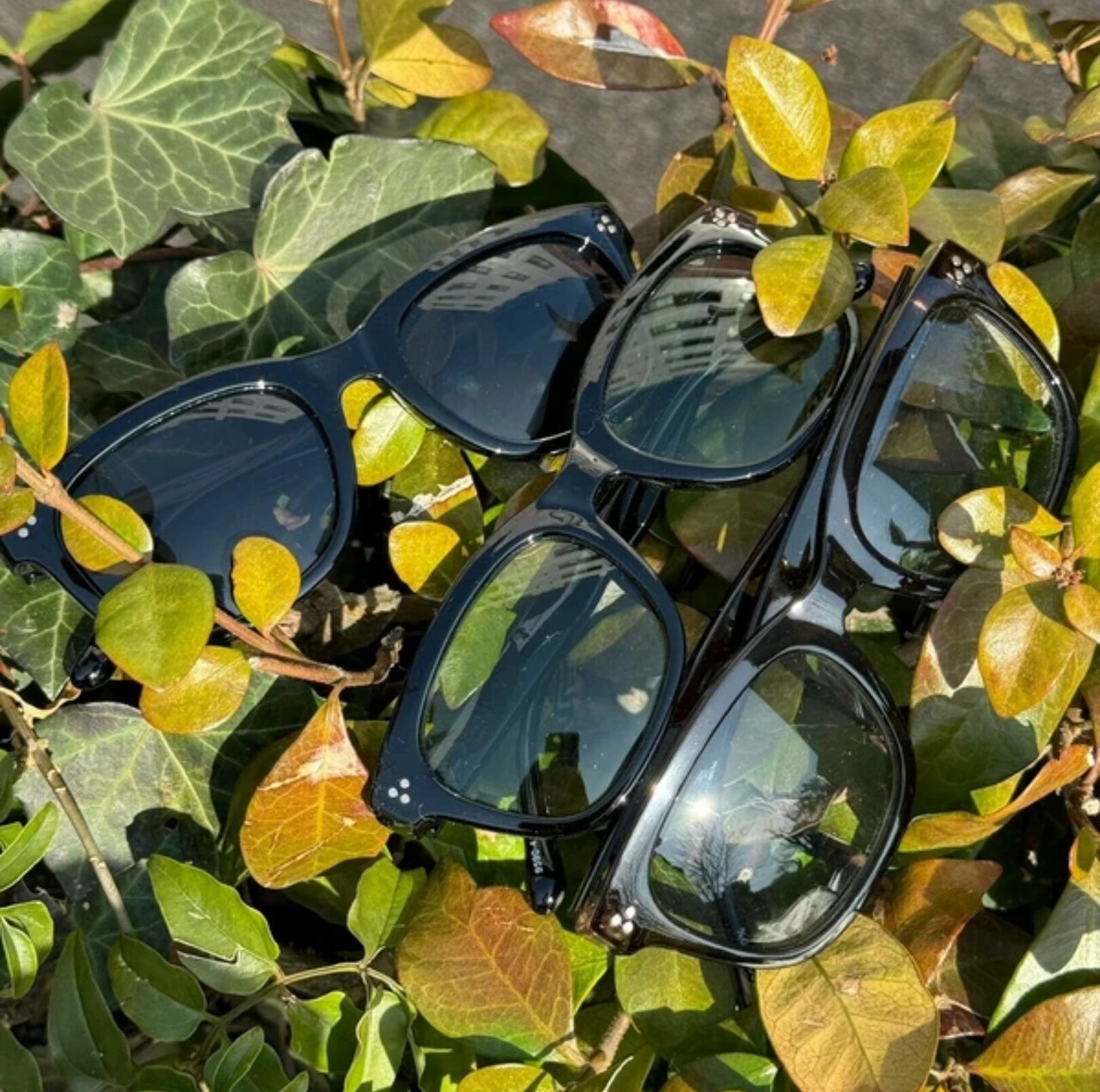 太めなブラックフレームとエレガントなグリーンカラーレンズが特徴のサングラス。