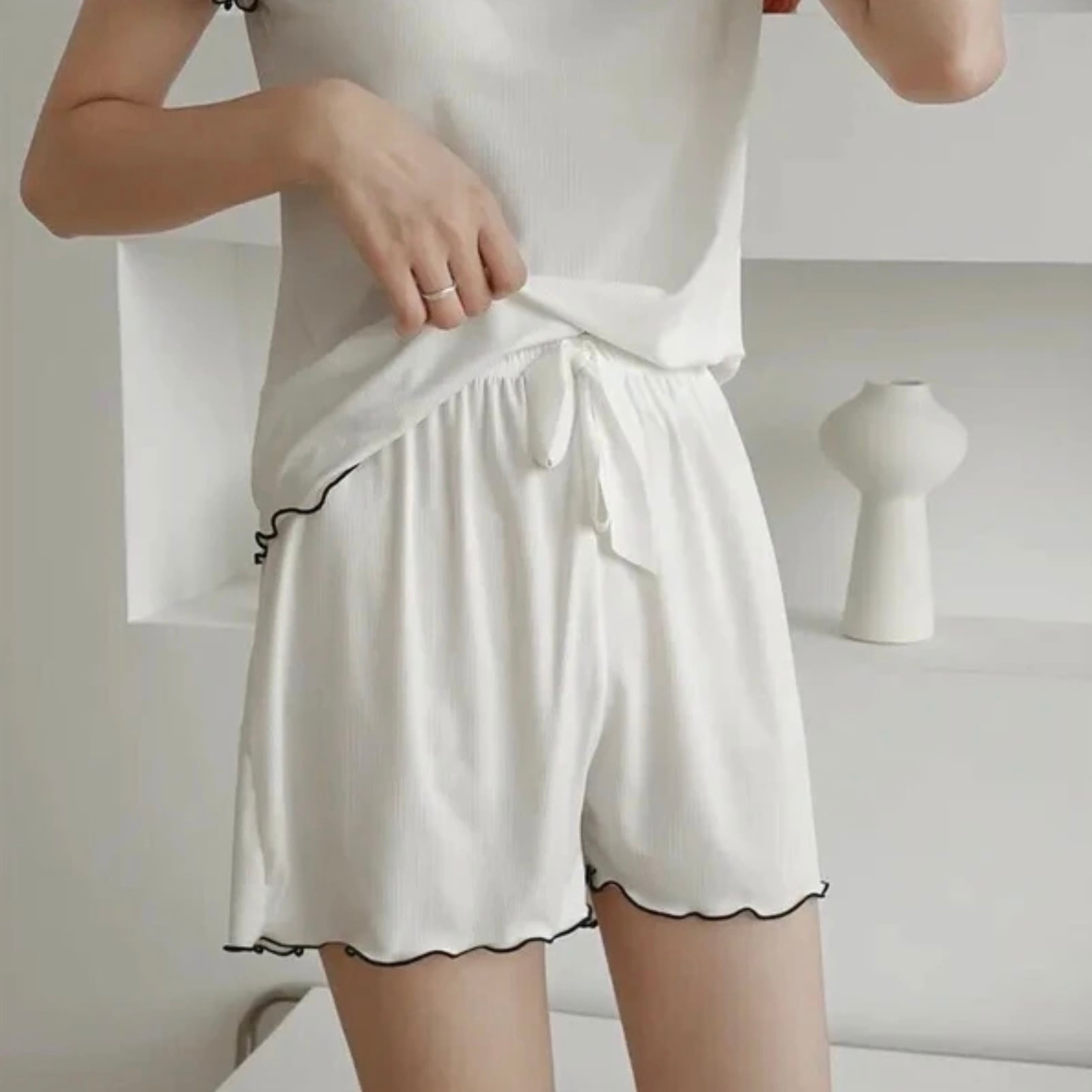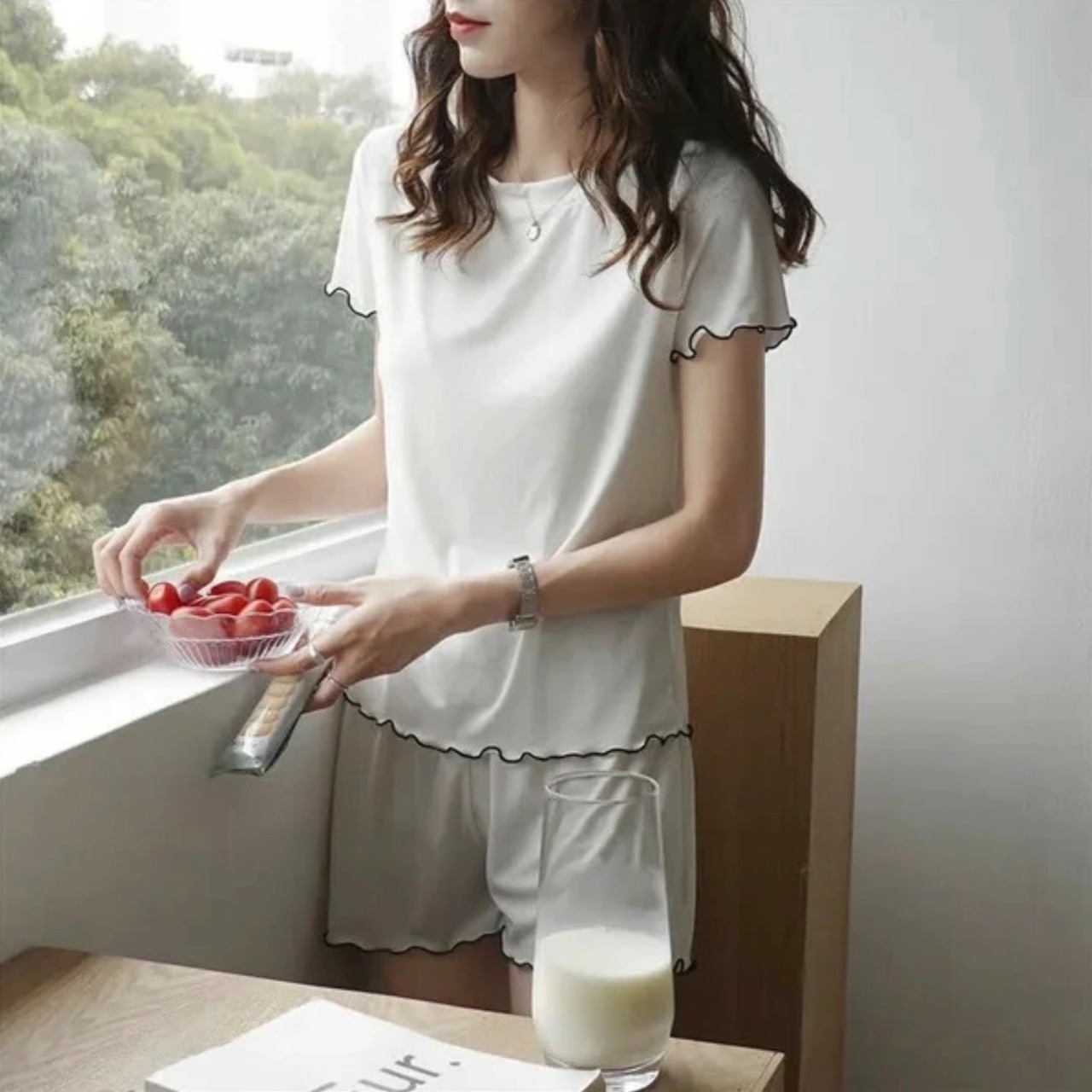 袖と裾をメロウで仕上げた上下セットアップのルームウェア。