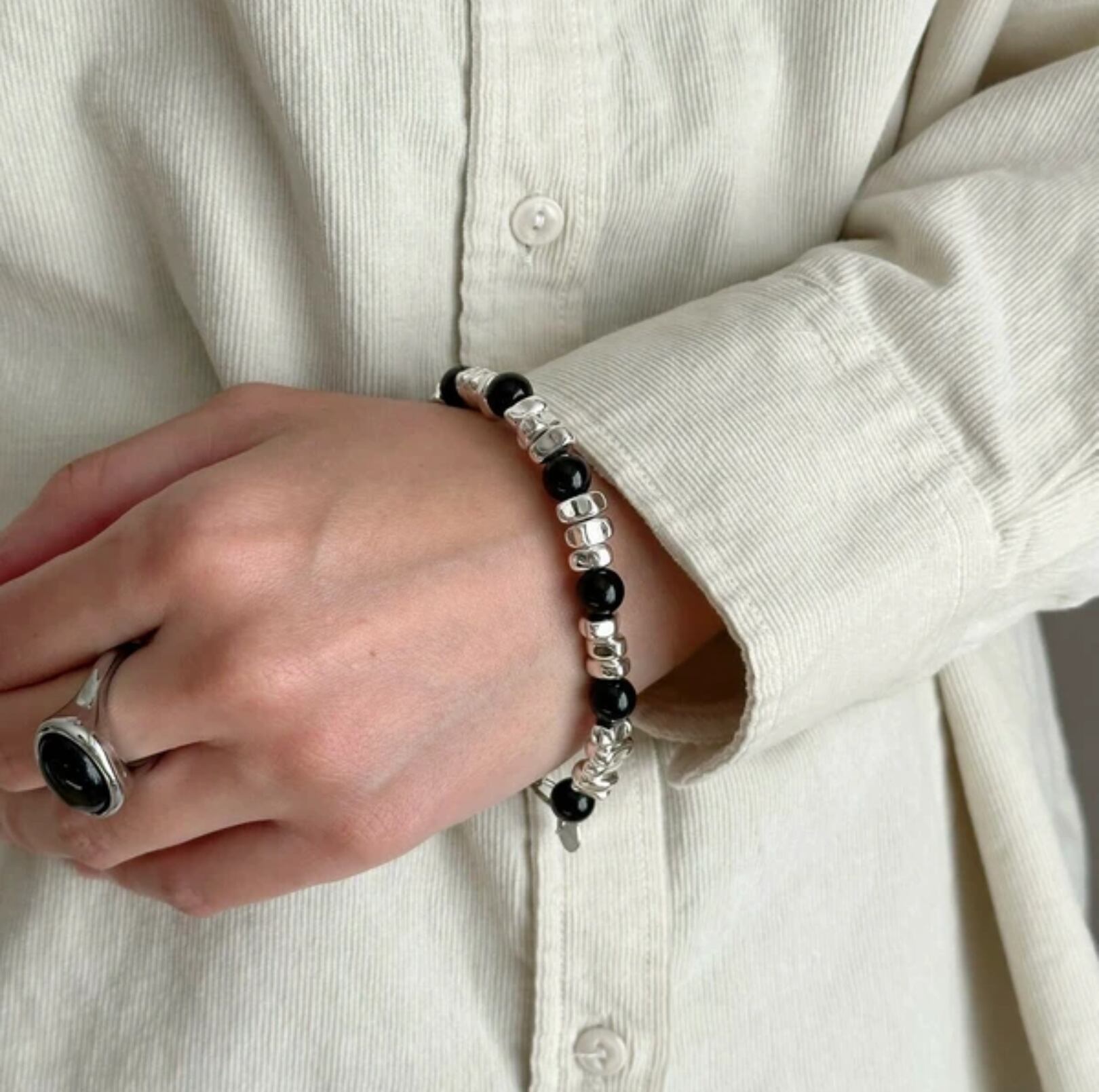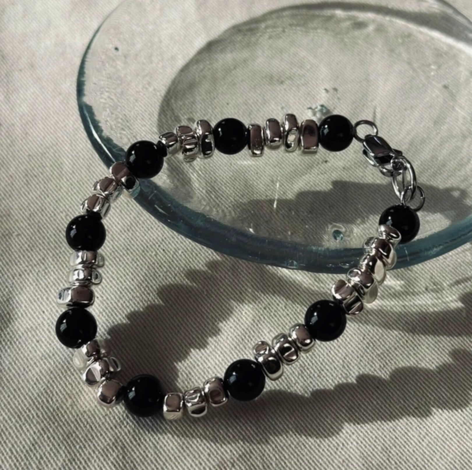洗練されたニュアンスパーツを連ねたサージカルステンレスのブレスレット。